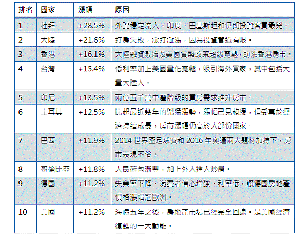 根據CNN Money的報導,全球最火熱的房地產市場,杜拜第一,接下來兩岸三地包辦了第二到第四名,報導還明確指出台灣房價上漲,部份拜陸客買房的推升之賜。