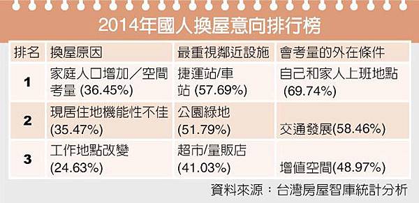 台灣房屋昨發布「2014年國人換屋意向調查」,根據在網路回收1560份問券統計後得知,有29.01%的民眾想要在1年內換屋,換屋動機為「家庭人口增加/空間考量」(36.45%),其次為「居住地生活機能不佳」以及「工作地點改變」。