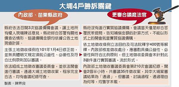 大埔案已失去兩條不能復返的人命;苗栗大埔拆遷戶控告內政部徵收違法,原判拆遷戶二十八人敗訴,台中高等行政法院更一審宣判,張藥房四戶九人逆轉勝訴,其餘駁回。