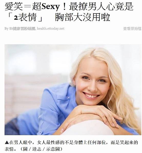 原來女人最性感的不是身材,而是臉上的表情!男人往往給人視覺動物印象,總被認為一個人的美醜是用他們的眼睛來判斷的,不過加拿大心理學家卻推翻了這個現象,原來男性眼中的性感並非胸部大小或是屁股翹不翹,而是女性情緒上的吸引力,其中又以2個表情最有魅力,想要撩人就多笑吧!