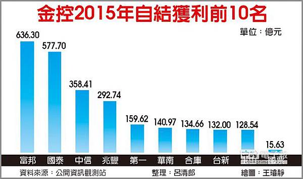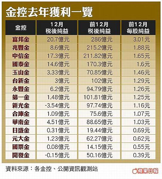 15家金控去年獲利陸續出爐,其中不少金控獲利都創新高,富邦金(2881)去年稅後賺326.93億元,EPS為3.31元,連5年居金控獲利王;值得注意的是,國票金去年EPS 0.52元,獲利暫居已公布金控之末。