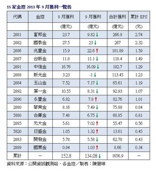 15家上市櫃金控9月獲利全數出爐,合計全體金控前3季賺1656.9億元,幾乎提前追平去年全年總和,比去年同期成長21%,續創新高。金控前3季EPS獲利王仍由富邦金(2881-TW)蟬聯,但累計前3季稅後純益,國泰金(2882-TW)已經小贏超越富邦金稱王;另外,新光金(2888-TW)則是9月單月獨虧金控。