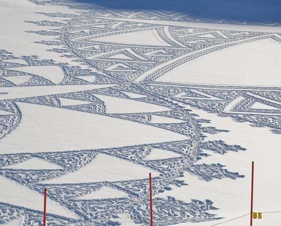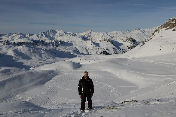 神秘麥田圈被視為外型人的傑作,而來自英國伯克郡55歲的貝克,以鞋印「踩」出雪地版圖形作品。本身就是地圖繪製師的他,每逢滑雪季就會前往法國短居,沉迷在美麗雪景中,興起了作圖的點子,利用雙腳、指南針和一雙雪鞋,在一片白茫茫的雪地中,創作驚人傑作。