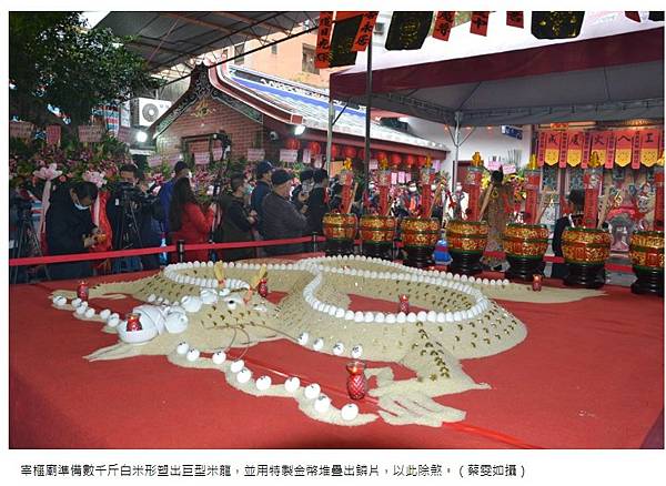 新北市三峽宰樞廟昨日舉行「入火陞座大典」祈福,廟方用數千斤白米形塑出巨型米龍,並用特製金幣堆疊出鱗片象徵除煞。(蔡雯如攝)