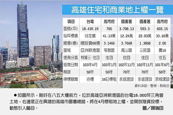 高雄地上權標租案開跑了!1月16日,高市府位於生日公園的住四土地765坪,將揮出今年第一棒,每坪底價41.13萬元,另外,台電位於亞洲新灣區內的18,439坪精華地,也將在4月重裝起跑,由於總投資金額高達60億元,並對陸資採取開放態度,而引起各界矚目。