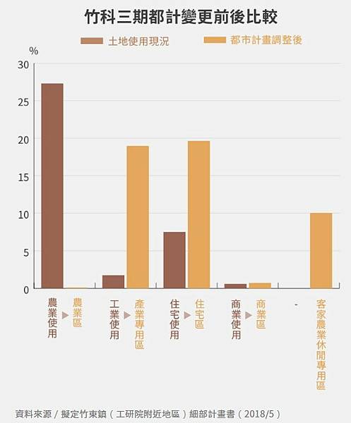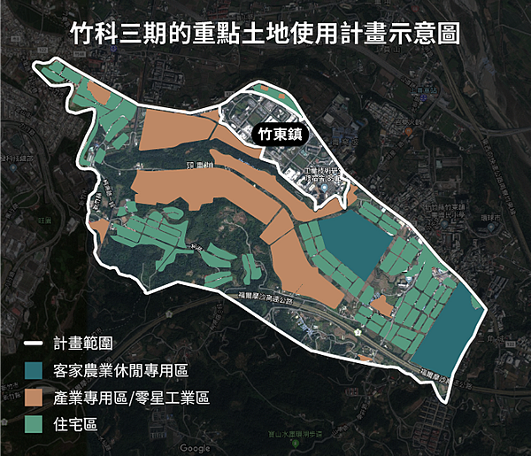 據新竹縣政府規劃,竹科三期開發案都市計畫範圍面積共453.94公頃,其中產業專用區占90.52公頃,住宅區占56.96公頃,農業區占57.1公頃,公設面積則為129.41公頃,主要開發範圍是竹東頭重、二重、三重與柯子湖部分地區。