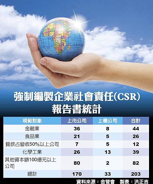 金管會今年首年「強制」化工、食品、金融業及資本額百億以上逾200家企業需編製CSR(企業社會責任)報告書,屬全球首創。金管會主委曾銘宗透露,年底會進一步檢討擴大至資本額50億元以上,光電鋼鐵等耗水、耗能或高污染企業明年6月擴大適用,估約增逾百家。
