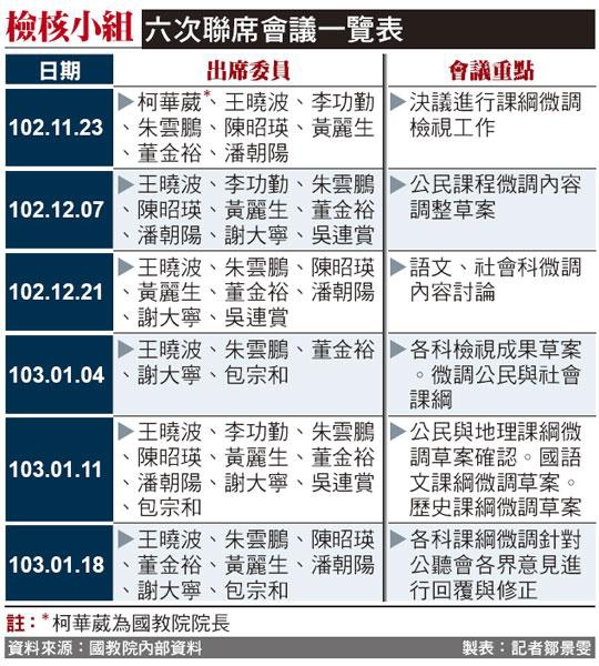 這十人名單包括:世新大學中文系兼任教授王曉波、佛光大學中文系教授謝大寧、台大政治系教授包宗和、中央大學經濟系教授朱雲鵬、台大中文系教授陳昭瑛、政大中文系名譽教授董金裕、師範大學東亞文化暨發展學系教授潘朝陽、高師大地理系教授吳連賞、海洋大學海洋文化所教授黃麗生、世新大學通識中心教授李功勤,並由王曉波擔任小組召集人。另國教院院長柯華葳曾參加過第一次的檢核小組聯席會議。