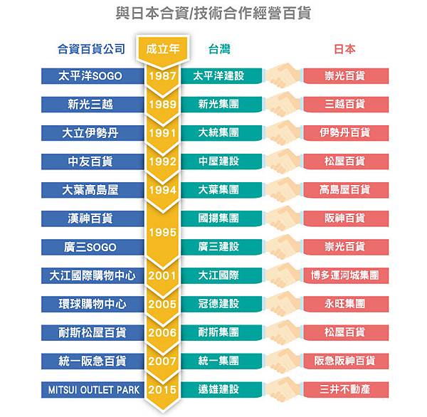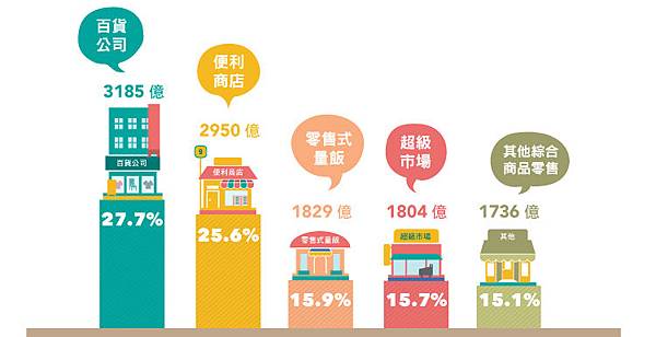 根據經濟部數據顯示,截至2014年底,我國前6大百貨公司總營業據點共80家,業者展店家數以台北市共30家、占37.5%居冠,其次依序為高雄市占11.3%、桃園市占10%、台南市與台中市皆占8.8%。