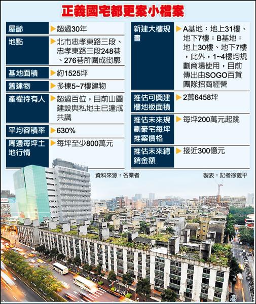 正義國宅的更新規劃分為A、B兩塊基地,基地面積一五二五坪,規劃地上三十一樓、地下七樓的建物,其中A基地規劃一○一戶大坪數豪宅,而B基地則規劃五十九戶小坪數住宅,預期住宅每坪價格至少兩百萬元起跳,粗估可興建的樓地板面積約二萬六四五八坪,全案總銷金額概估接近三百億元。至於地上一至四層則規劃為商場,目前得知將由SOGO百貨團隊負責招商經營。