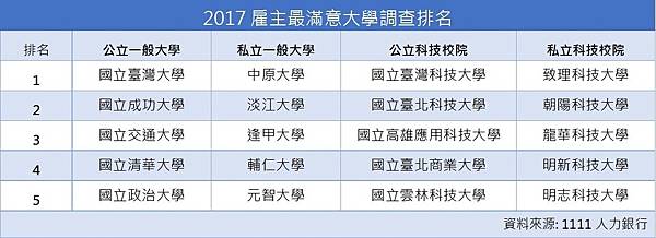 1111人力銀行「2017雇主最滿意大學」調查結果,最滿意大學公立前3名是台灣大學、成功大學、交通大學;私立大學則是中原大學、淡江大學、逢甲大學,去年冠軍輔仁大學降至第4。