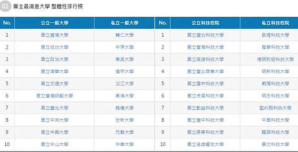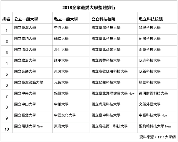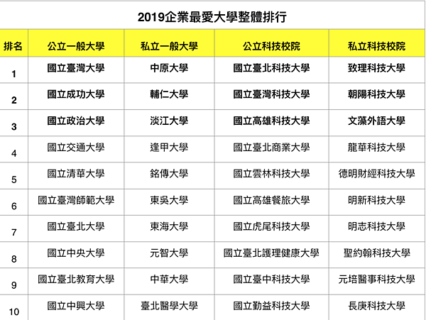 根據1111人力銀行「2019企業最愛大學調查」顯示,台大、成大再度蟬聯公立大學的冠亞軍,私立大學前幾名和去年相比不動如山,中原大學穩坐私立學校冠軍,輔仁、淡江、逢甲緊追在後,其中私立東海大學大幅跳升3名;公立科技院校部分,近年來名次互有消長的台北科技大學與台灣科技大學,這次由台北科技大學再度領先,坐上冠軍寶座,而高雄科大受益於3校合併規模提升,排名躍居第3。