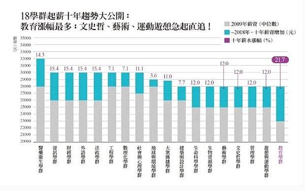 至於漲幅最少的是地球科學學群,漲幅僅3.6%,和十年前比較,起薪只多1000元;當紅的「工程學群」,看似整體十年起薪只多2000元,增幅僅7.1%,實因各校學生程度落差懸殊,導致薪資走向兩極化;傳統印象中薪資不高、職缺不多的「文史哲」和「藝術」學群,在新興產業的需求其實很大,薪資不悲觀,十年起薪增加3000元,漲幅12%,與「生科」「生資」「管理」「遊憩」並列第七。*更多相關內容請詳見《遠見》出版《2020大學暨技職入學指南》《遠見》調查企業最愛理、文組大學 教育系畢業生錢途看漲! | 大學研究所 | 文教 | 聯合新聞網 http://bit.ly/327hGPK