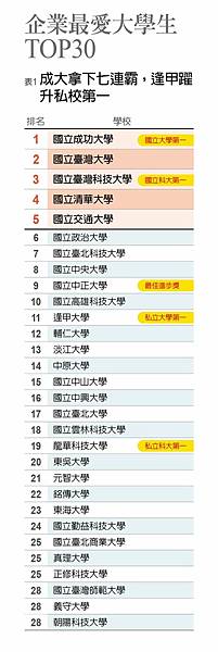 《Cheers》表示,除成大外,台灣、交通、清華、政治大學有名校光環,長期受到企業歡迎,排在第2至5名;但前30大排名中,有9所科技大學,企業最愛榜單,也是最渴望產學合作的學校,「考場勝利組」不等於「職場勝利組」。