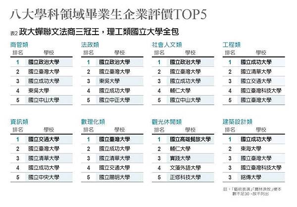 從分榜來看,各產業領域企業主最愛大學,清大拿下理工類三領域榜首,台大在「數理化」領域與清大並列第一;政大則第二年拿下文法商類三領域榜首,台大則包辦三領域亞軍;「觀光休閒」由高雄餐旅大學蟬連榜首。