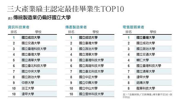 不管是資訊科技、傳產製造或零售服務業,成大都是雇主心目中的前三名,其中,在「資訊科技業」與「傳產製造業」都拿下第一,台大則是「零售服務業」雇主認定的最佳畢業生(見表3)。好強!成大連七年奪企業最愛大學,「這所大學」打敗淡江奪私校之冠 https://bit.ly/2Mxhbeg