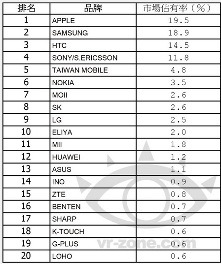 根據 GFK 數據顯示,台灣市場前 10 大智慧型手機廠商在扣掉前三名的 Apple、Samsung 與 HTC 後,其他依序爲 Sony Mobile、Taiwan Mobile、Nokia、MOII、SK、LG 以及 ELIYA。