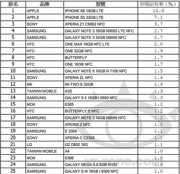 前 10 大手機排行榜中,iPhone 5s 以 16GB 和 32GB 位在第一以及第二位,佔有率合計 17.7%;第三位則是 Sony Mobile 在 9 月底推出的 Xperia Z1 C6902 ,佔有率爲 3.7%。