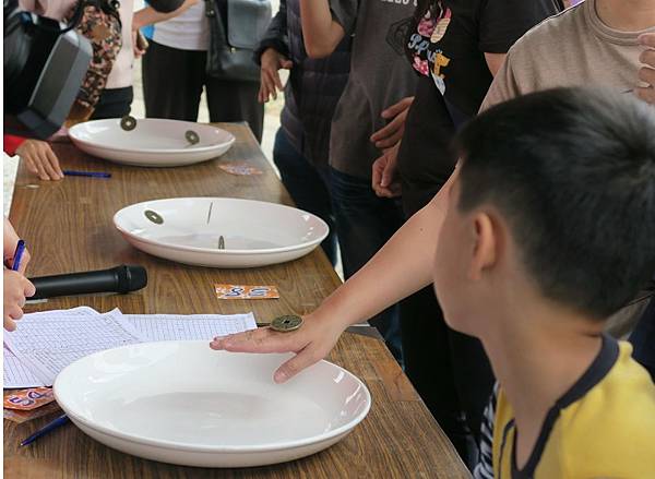 參賽者與關主同時口喊(三烏喔~)後將三枚銅錢置於手背並向上拋投,落在陽面(八卦圖)的銅錢多於關主即過關,每位參賽者可投擲三次。