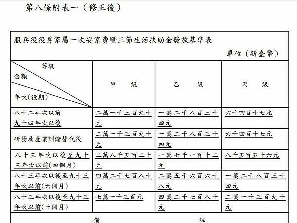 此外,應徵召後備軍人、備役役男及補充兵家屬一次安家費及當節生活扶助金發放基準也同步調高近4成,依照等級與家庭口數,可領2139至28520元。