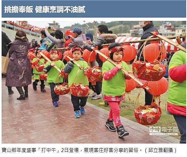 寶山鄉2日舉辦年度最大盛事「打中午」,「打中午」為客庄凝聚地方居民情感的傳統,已持續上百年未曾中斷。為因應健康飲食潮流,今年最特別加入新竹縣政府及寶山鄉衛生所的「健康挑擔」,供應的食菜餚在烹調上選用蒸、燙及炒等的方式取代油炸,減糖減鹽少油,讓民眾吃出食材的天然風健康飲食、分享福氣。