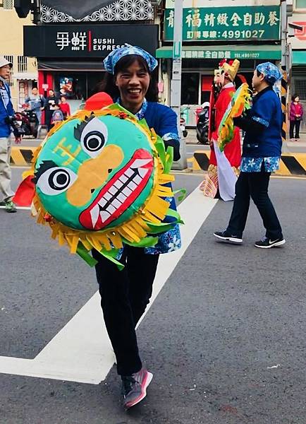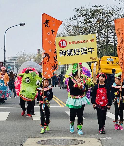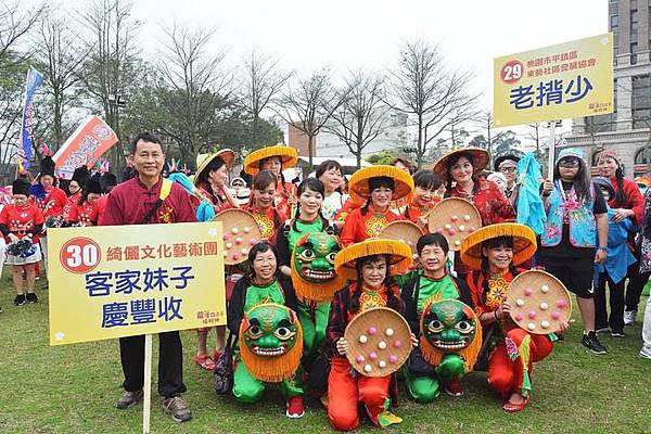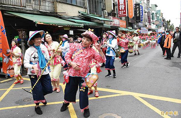 昨天參與踩街的隊伍,包括龍潭各學校、社區、社團及公司行號,不分男女老少,從三歲孩童到八十多歲的爺爺奶奶都有,敲打節奏感強勁的森巴鼓沿街表演,還有客家傳統民俗隊、客家大偶,讓外地遊客體驗客家民俗風情。