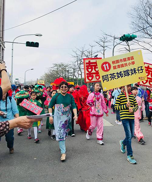 「2018龍潭迎古董接財神」3日在龍潭市區登場,共38隊近2000人參加,各隊伍遊行踩街,並裝扮成八仙過海、老鼠討新娘、草蜢撩雞公等主題,過程吸引大批民眾圍觀,見證從日據時代延續至今的龍潭盛事。