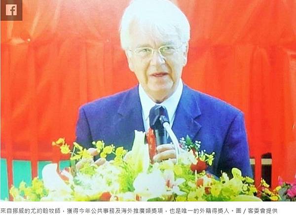 來自挪威的尤約翰牧師,獲得今年公共事務及海外推廣類獎項,也是唯一的外籍得獎人。圖...