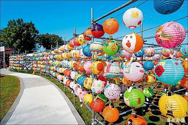 東勢「燈龍迷宮」由地方居民跟學生繪製三千個客家彩繪燈籠作為佈展基材。(記者張軒哲攝)