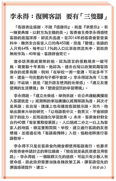 台大社科院的前院長邱榮舉也說,台灣客家運動已經30年了,其實不是只有客家話,每個族群的母語都應該要尊重,現在世界各國對於每個族群的母語也都在推行「母語權」,台灣的客家人是台灣人口中非常重要的組成,李永得主委是台灣的客家人,講客家話也是台灣話,如果李永得不能講自己的母語,要聯合海內外客家人一起關注抗議這件事,讓這種情況不會再發生。