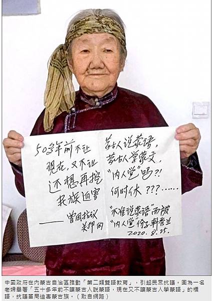 中國政府在內蒙古自治區推動「第二類雙語教育」,引起民眾抗議。圖為一名老婦舉著「五十多年前不讓蒙古人說蒙語,現在又不讓蒙古人學蒙語」的標語,抗議當局迫害蒙古族。(取自網路)