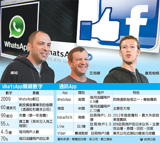 臉書執行長查克柏格正持續把通訊、新聞等應用程式(App)納入麾下,盼吸引更多手機和平板用戶。WhatsApp 2009年創立至今用戶已逾4.5億人,比擁有2.4億名用戶的推特(Twitter)更受歡迎。