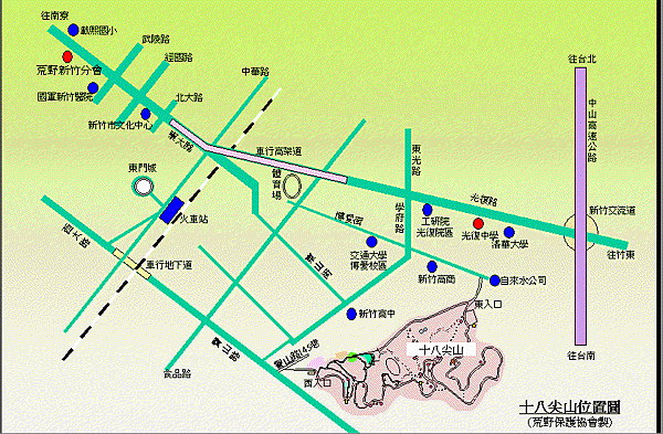 十八尖山位在新竹市東區的十八尖山 海拔僅有130公尺 雖然山不高, 但由於是新竹市區內 最大的郊區森林公園具代表性 因此被入選為台灣小百岳