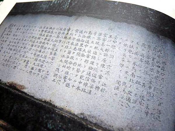 不過,水泥的耐久年數其實不長,所以約從十年前開始,糊在碑文上的水泥漸漸剝落;覆蓋於石碑上的茂盛雜草,也似乎有人將之割除。現在碑上所刻的文字,已經能清楚地看到。」