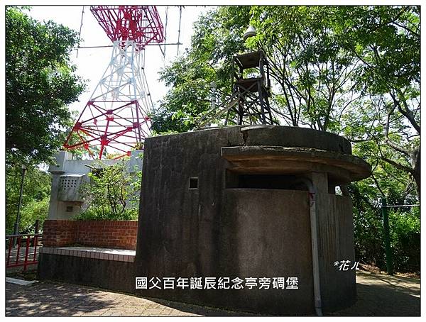 十八尖山的三角點在「國父紀念亭」旁的碉堡上,很順利找到三角點後,就照著「歐都納小百岳」手冊的指示,跟碉堡拍照,輪流拍完後離開,又想到沒有合照,又跑回來再拍,路人看我們跟醜醜的碉堡拍照很好奇的說「應該跟美麗的國父紀念亭拍呀~」,哈~他們不知道我們在收集小百岳
