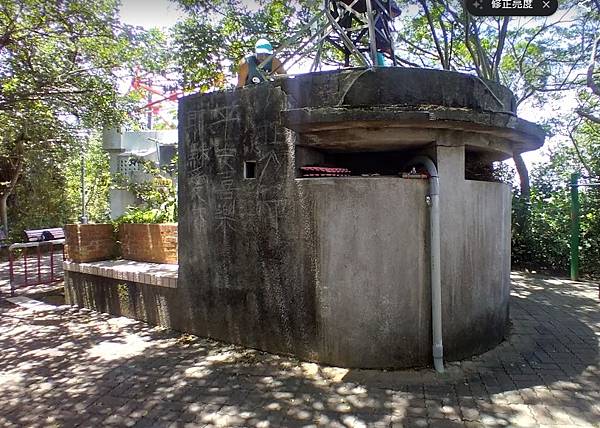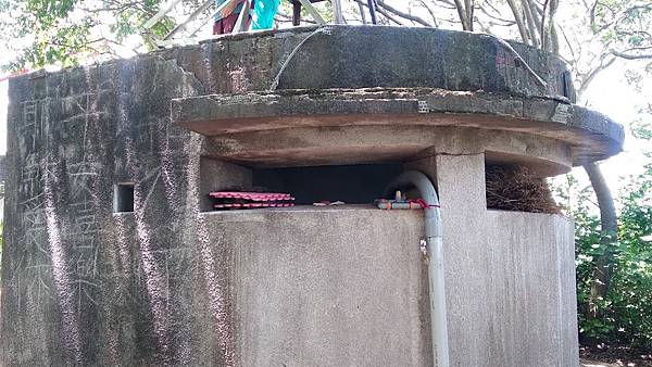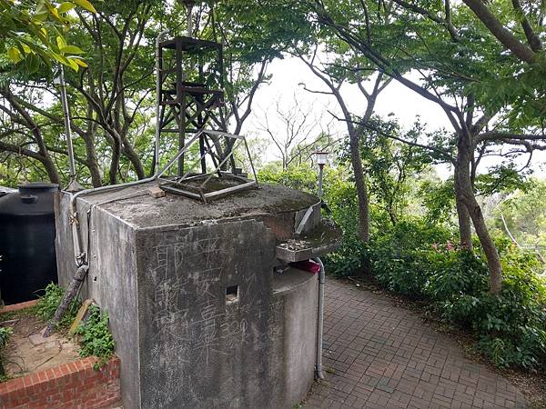 十八尖山的三角點在「國父紀念亭」旁的碉堡上,很順利找到三角點後,就照著「歐都納小百岳」手冊的指示,跟碉堡拍照,輪流拍完後離開,又想到沒有合照,又跑回來再拍,路人看我們跟醜醜的碉堡拍照很好奇的說「應該跟美麗的國父紀念亭拍呀~」,哈~他們不知道我們在收集小百岳 1030506‧雨中逛新竹小百岳「十八尖山」、「飛鳳山」