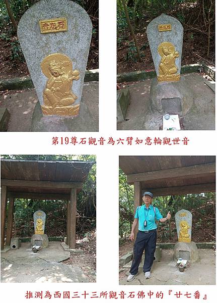 右手持一龍杖,後有一蓮花, 前有一紫竹林觀音,石碑傾斜。 |
