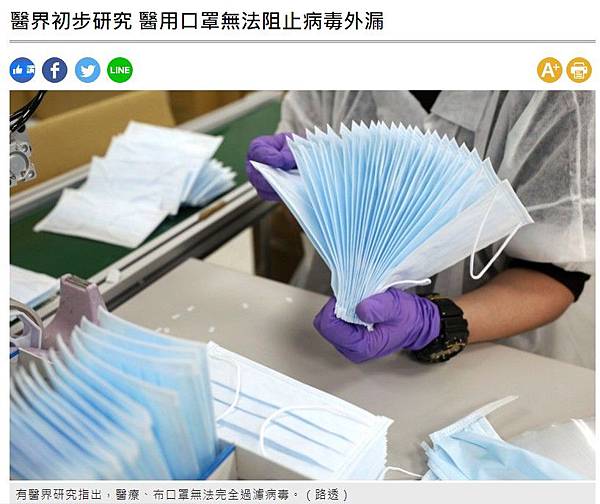 有醫界研究指出,醫療、布口罩無法完全過濾病毒。(路透)醫界初步研究 醫用口罩無法阻止病毒外漏 - 國際 - 自由時報電子報 https://bit.ly/2wpkmx2