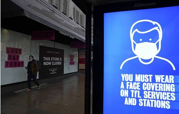 1月倫敦一處公車站宣導戴口罩防疫。(美聯社)