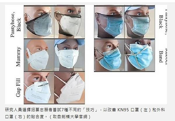 研究人員選擇招募志願者嘗試7種不同的「技巧」,以改善 KN95 口罩(左)和外科口罩(右)的貼合度。(取自劍橋大學官網)