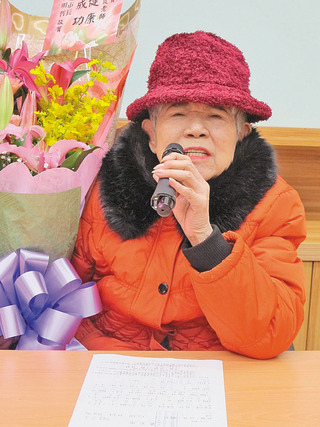 「我又回來了!」高齡84歲的賴碧霞在女兒趙彩雲陪伴下一現身課堂,馬上獲10多名學生熱烈掌聲,他們開心地以手打節拍,高唱客家山歌「農家曲」歡迎老師回來,讓賴碧霞笑著說「我都沒戲唱了。」