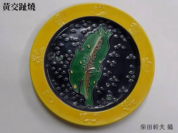1940年逍遙園開園紀念瓷盤,以豬、鳳梨、柑橘、水牛等物產圖案圍繞台灣。