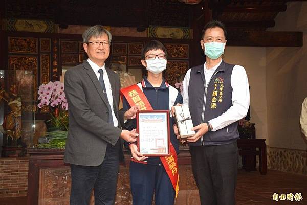 大甲區長顏金源(右)頒發獎狀鼓勵大甲高中學生趙世中。(記者歐素美攝)