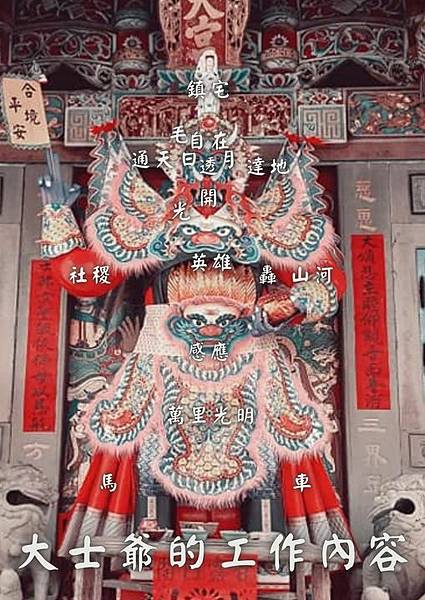 開完光有了靈力後大士爺開始執行任務 #鎮守廟門,一動也不動的站在廟的中門看守,大士爺面前的方桌上會留下前晚開光使用的硃砂墨以及寫有「萬里光明」的鏡子,前排五個空杯子,右側放上一瓶米酒,再前一排為三碗糖果,最前排為一碗白飯、一雙竹筷及一碗菜湯,右側再擺上「觀音大士臺前秉佛心印」表文,以及天金、福金等紙錢。