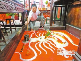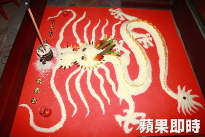 昨為法會首日,吸引百餘信徒祈福,廟方透露,法會前3日,道士正在神像前放擺放長達80公分的「米龍」,以白米鋪設以安龍謝土,信徒以手機拍照,事後發現照片中出現「龍尾」,一道白色霧影恰掃過三山國王神像頭頂。
