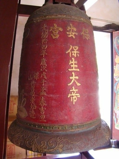 第二例為臺北市大龍峒保安宮鐵鐘,通高5尺,口徑寬3尺2吋,懸於鐘樓上。鐘體略呈彈頭型,下緣的鐘口平齊,末端外撇作喇叭口。鐘體正面為神座型開光,開光內填有「風調雨順」;另一面為雲龍出水紋,內有「國泰民安」。鐘口一側有陽文楷體之「保安宮保生大帝」,上款為「光緒拾四年嵗次戊子孟春吉旦」;鑄造者為「禪山信昌老爐造」。 「禪山」即佛山之稱,寄附者為「沐恩弟子張怡記 杜玉堂仝敬奉」。該件鐘形即屬於相當標準的佛山鐵鐘之特徵。