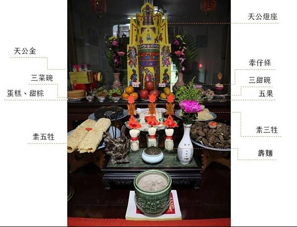 民俗專家廖大乙表示,拜天公準備的供品可隆重也可簡單,但最好都是素食,麵線、壽桃、米粩、花生粩、麻粩、生仁、紅圓、糖果…皆可,水果則可準備代表「大吉大利」的桔子,有「招來旺」之意的香蕉、梨、旺來(鳳梨)。