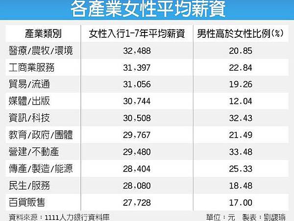 各產業女性平均薪資