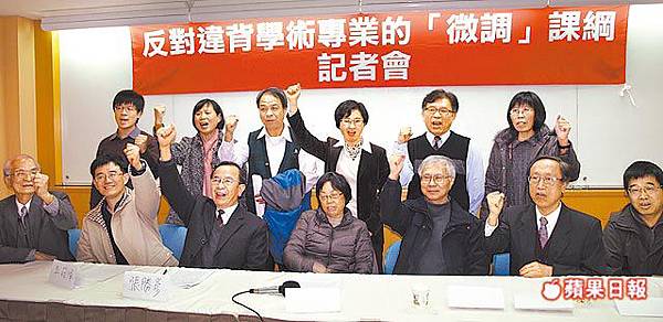 〔記者陳怡靜/台北報導〕課綱微調案不僅被外界質疑違反程序正義,過程黑箱作業,更引發學界大反彈。國內歷史學者昨聯合召開記者會,痛批馬政府強力主導高中歷史課綱、微調程序違反學術專業,包括中研院史語所所長黃進興、中研院台史所所長謝國興、台師大台史所所長張素玢、詩人向陽等逾一百四十名學者連署抗議,要求教育部撤回課綱微調案。