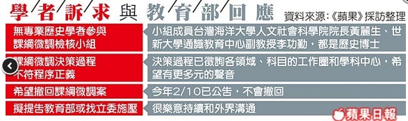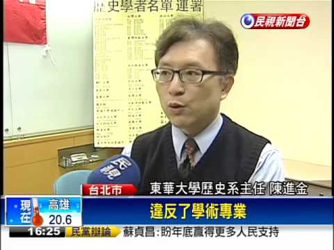 台灣歷史學會理事長蔡錦堂說,課綱是教科書原則性提示,不是談細微用字,教育部選在學期末過年前強硬草率通過,顯示馬政府的急迫性。東華大學歷史系主任陳進金指出,連署學者不分領域,他自己就是研究中國史,因為微調一事實在太荒謬,竟還是由教育部推動。